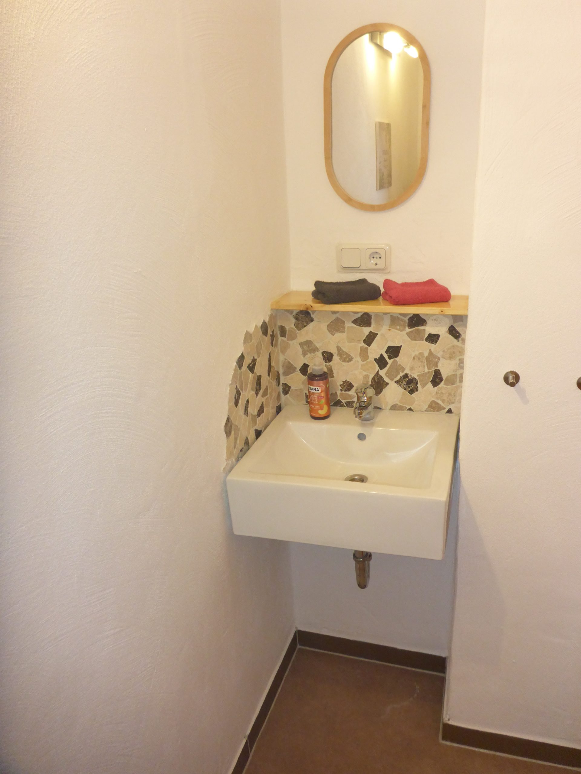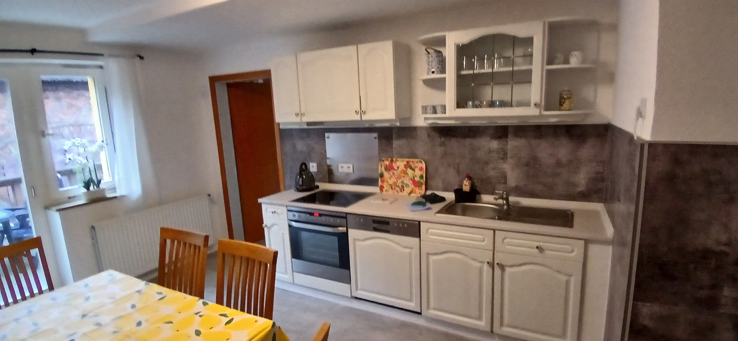 1 Schlafzimmer (Doppelbett), Wohnküche mit Küchenzeile, Essplatz und Couch, SAT- TV, Bad mit ebenerdiger Dusche, Sitzmöglichkeit auf der Wiese im Garten am Haus, überdachter Eingang und Parkplatz im Hof. Verschaffen Sie sich einen ersten Eindruck in der Bildergalerie – KIRSCHBLÜTE.